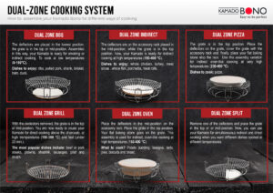• A baking stone is essential for cooking in the Kamado Bono grill, such as pizzas, pies, kugelis, pastries, and more